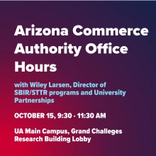 Oct 15 Image Arizona Commerce Authority Office Hours 9:30 – 11:30 a.m., Oct. 15, 2025 Wiley Larsen, ACA Director of SBIR/STTR programs and University Partnerships, will be on hand to meet with faculty, postdocs and students to share information about SBIR/STTR funding, Venture Start, Arizona Tech Week, Arizona Innovation Challenge, and other startup programs.